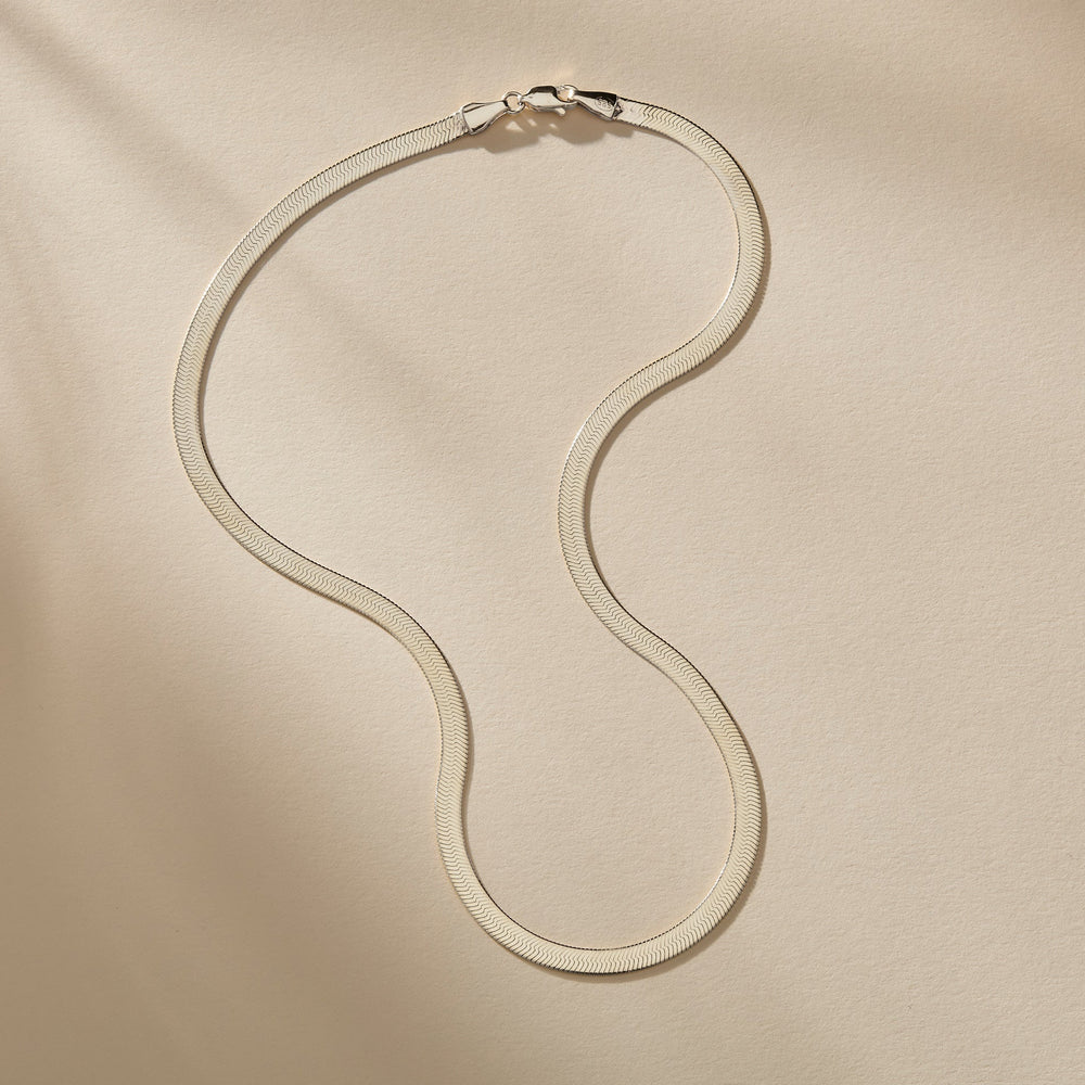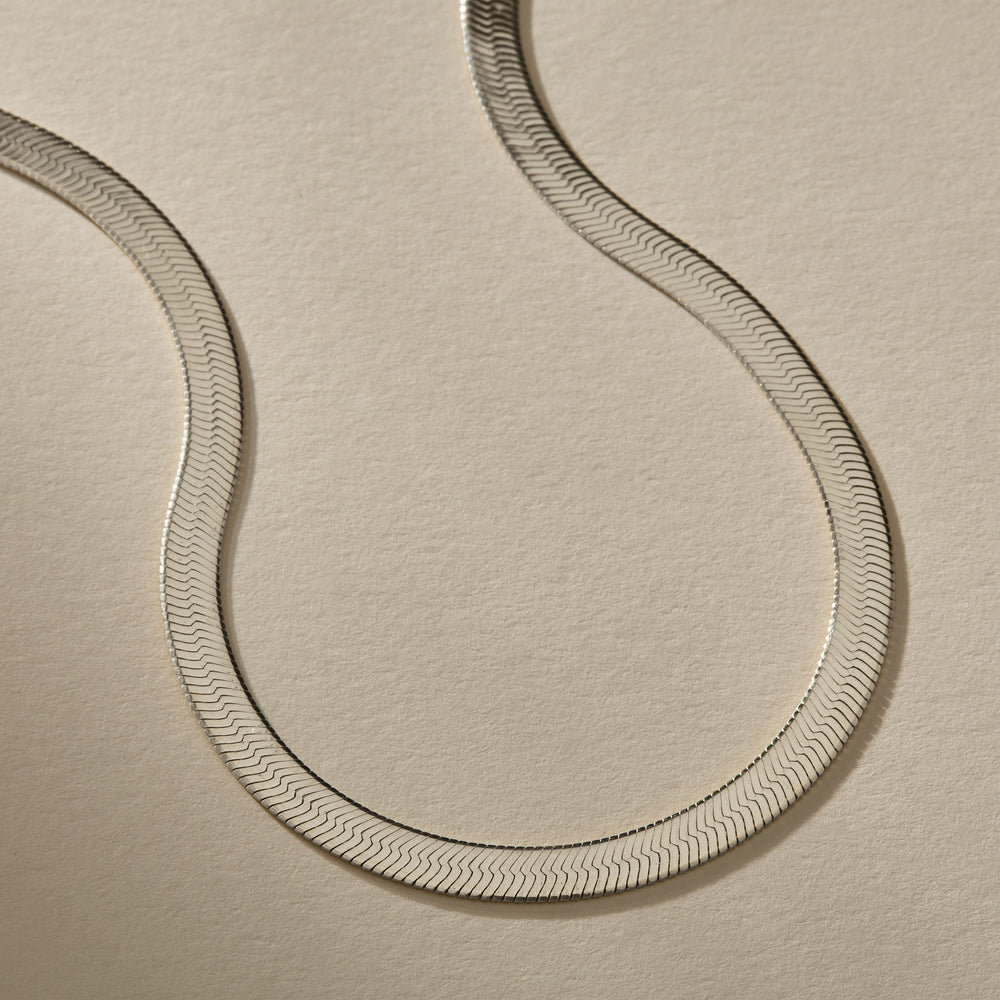 This gorgeous and substantial 4.5mm, sterling silver herringbone chain frames the neck and can be worn alone or layered with other necklaces.