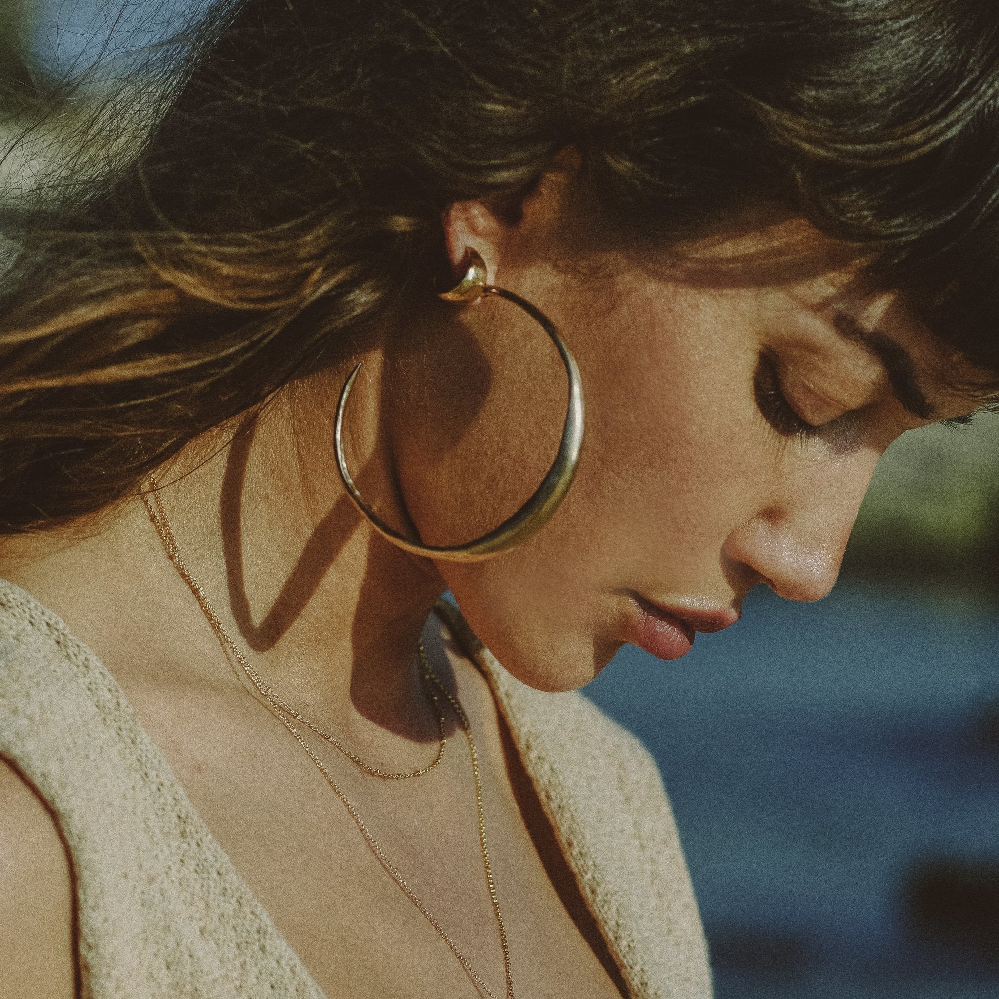 Channeling boldness, beauty and power these statement hoops tell the world you are fearless. These gorgeous best sellers are organically shaped, flowing with feminine grace from thin unto wide towards the middle. Scooped out at the back this powerful adornment can be worn every day bring a feeling abundance and celebration to every look