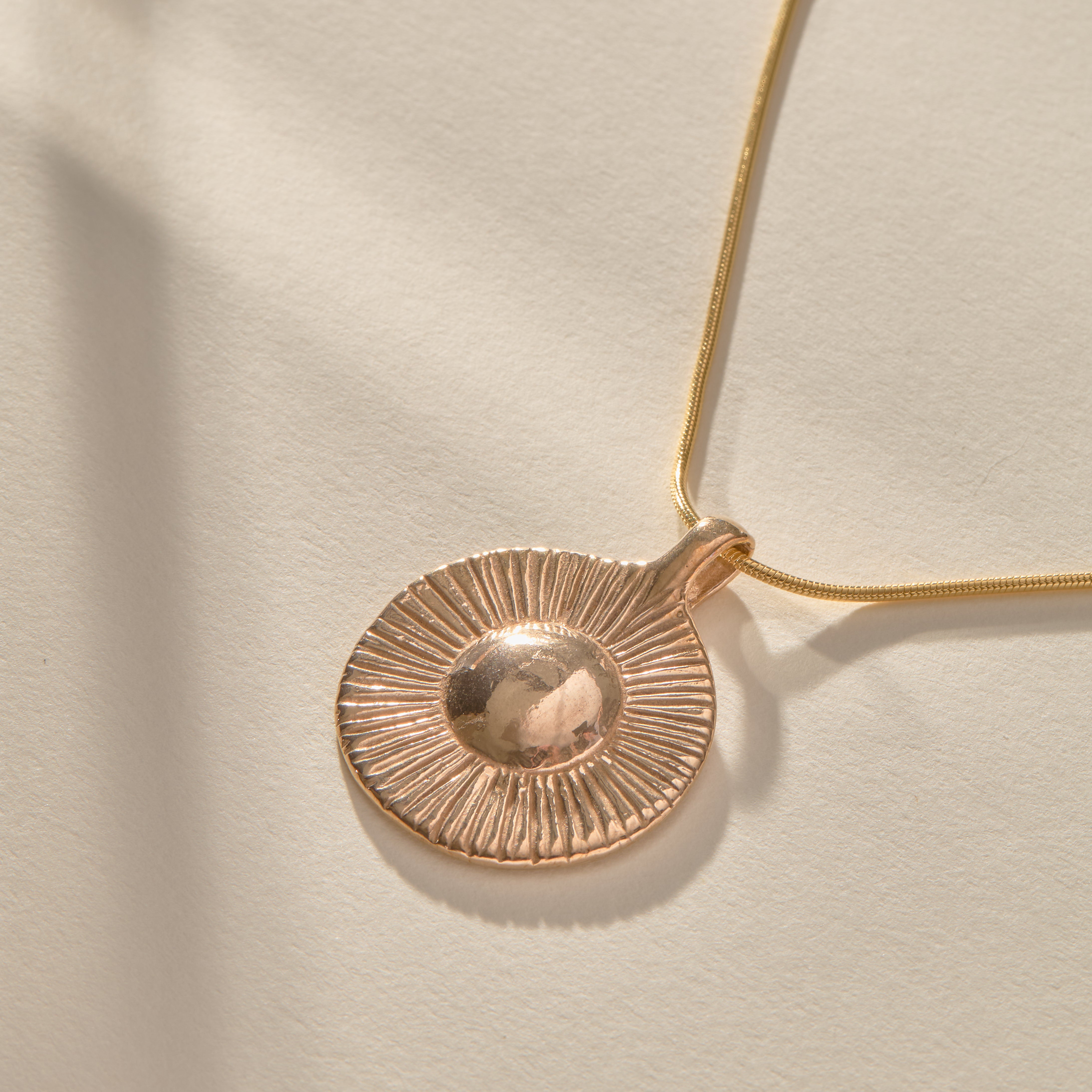 An ode to the light. This pendant hugs the heart chakra for a beautiful strong look. Created to honor the solar energies of light and life.